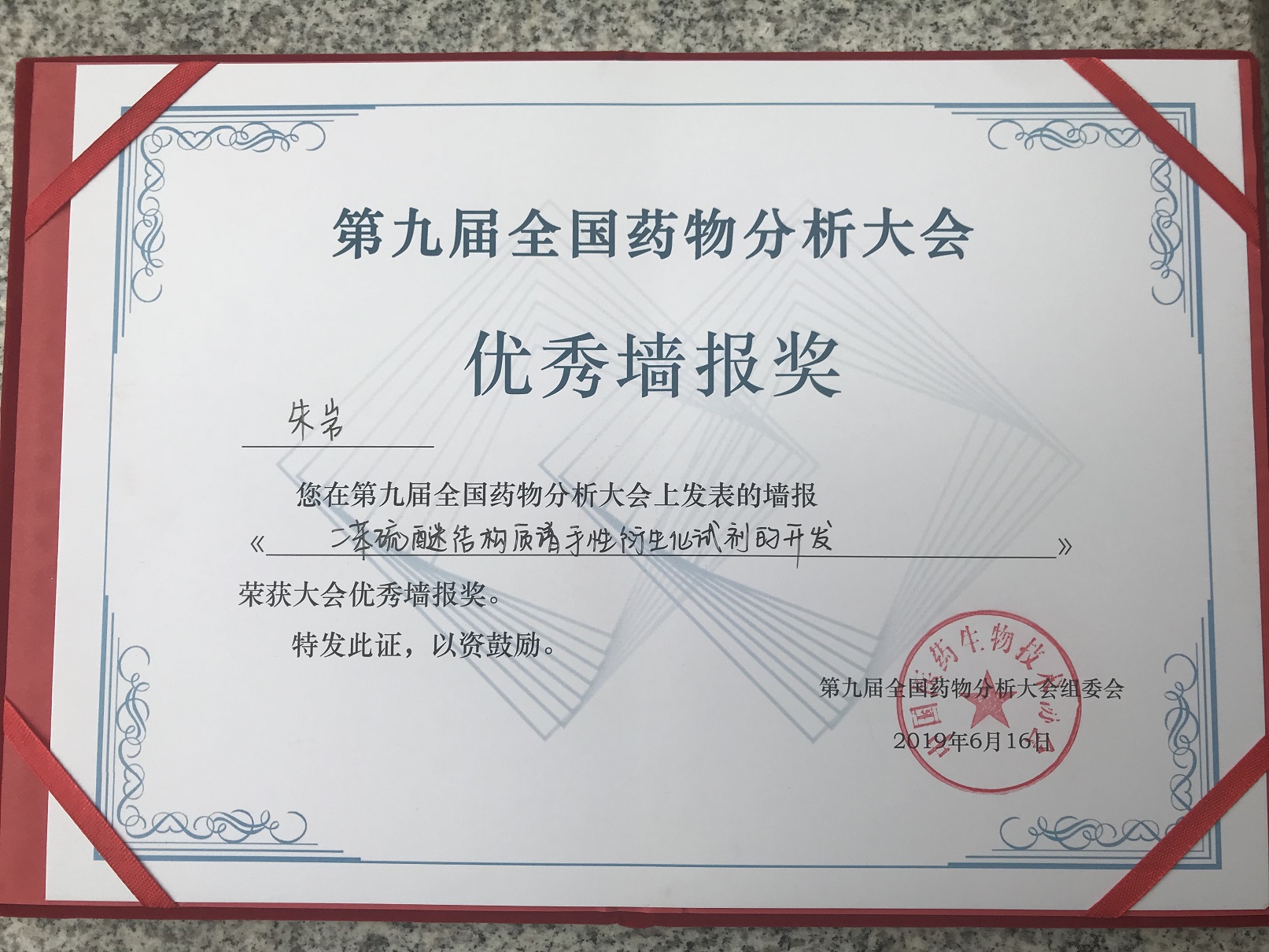 闵俊哲副教授带领硕士二年级学生朱岩、孙晓琪、罗苗、韩宇4名同学参加了本次会议,以《二苯硫醚结构质谱手性衍生化试剂的开发》;《DBD-S-M-Pro新型荧光手性衍生化试剂的开发》;《糖链相对定量分析用同位素标记丙半胱氨酸新型质谱试剂的开发》;《人体唾液中尿酸干纸片法的开发》为题目进行了墙报发表。闵俊哲副教授以《靶向氨基、羧基官能团手性衍生化试剂的开发及手性拆分效能评价》做了大会口头发表。其中朱岩同学发表的《二苯硫醚结构质谱手性衍生化试剂的开发》墙报获得“优秀墙报奖”。