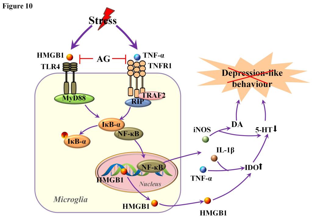 抑郁症是一种复杂的精神障碍疾病,其临床表现包括情绪低落、快感缺失及注意力不集中等,严重者可有厌世情绪及自杀行为。研究报道,在美国,重度抑郁症(MDD)终生患病率为16.2%,12个月患病率为6.6%,而在中国,MDD的患病率分别为3.3%和2.3%,造成了严重的社会经济负担。抑郁症的病理机制复杂,目前研究表明,小胶质细胞激活诱导神经炎症在抑郁症的病理机制中发挥着重要作用。本课题组近期发表牛蒡苷具有抗抑郁作用及其分子机制(Xu, et al, ACS Chem Neurosci. 2020, 11(15): 2214-2230)的基础上,进一步研究发现牛蒡苷的代谢物(牛蒡子苷元)通过HMGB1/TLR4/NF-κB、TNF-α/TNFR1/NF-κB信号通路抑制小胶质细胞激活和神经炎症反应,从而发挥抗抑郁作用,如图所示。
