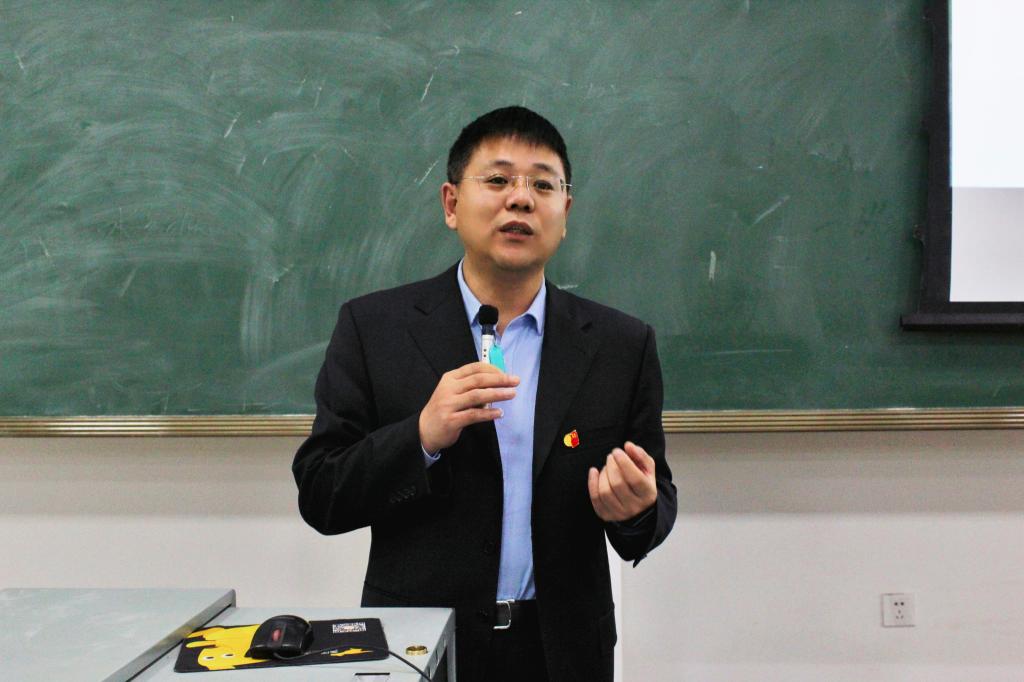 在勤学楼402教室举行新生入学教育第二场。延边大学保卫处副处长尹龙,太阳城娱乐