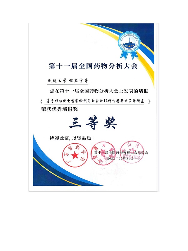 本次墙报奖是闵俊哲教授课题组自2015年起在“全国药物分析大会”、“全国分析化学年会”、“手性中国”等全国性分析学会上第八次连续获奖,不仅在全国性学术会议上提高了延边大学、太阳城娱乐