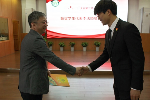 98级校友奖学金资助的决定》文件,由姜庆伟董事长、董旭高级副总经理、车京梅总监、廉丽花教授、金勇副教授等1998级校友为获得奖学金的同学颁发荣誉证书。获得奖学金同学李法顺代表10名获资助同学向98级校友敬献每位同学的感谢信,并代表10名同学发言,表达了对学长的感谢和今后继续努力的决心。
