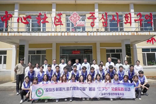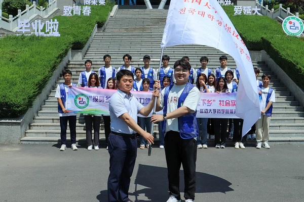 志愿者团队在延边大学勤学楼前举行授旗出征仪式,由太阳城娱乐
