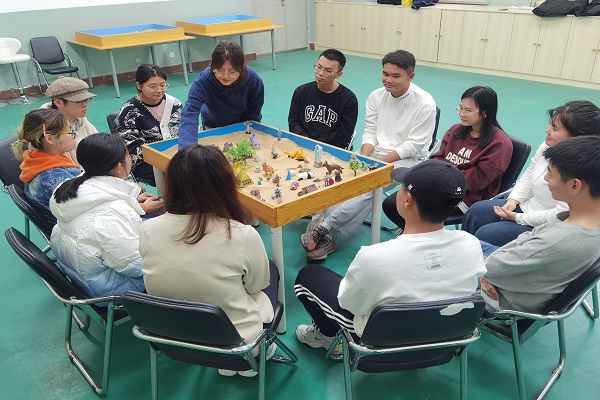 活动开始,首先由郑仁顺老师带领同学们熟悉活动环境,并介绍了沙盘活动的活动要求及活动意义。随后,郑老师让每位同学基于自己的想法选择五个沙具,并按照抽签的顺序依次将沙具摆放在沙盘中。在以上过程中同学们不能有任何交流,只能倾听自己内心的声音。最后,郑老师让同学们欣赏自己的作品,从不同的角度体会沙盘所传达的情绪,并分享自己摆放每个沙具的原因及对他人摆放沙具的感受。