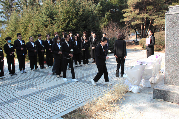 副书记赵成日、关心下一代委员会主任朴惠顺,各年级辅导员,以及部分学生,在林民镐塑像前开展祭奠活动。